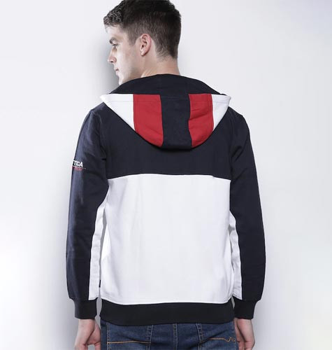 Men Navy Blue & White Colourblocked Hooded Sweatshirt