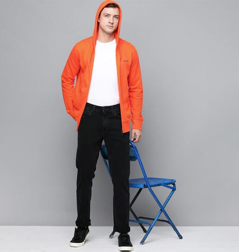 Men Orange Solid Hooded Sweatshirt