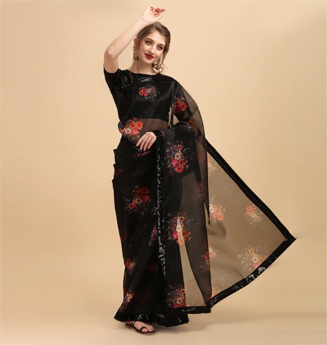 Black & Coral Floral Sequinned Organza Celebrity Saree