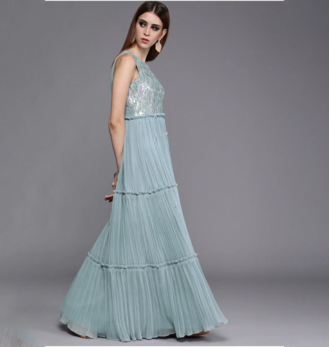 Women Blue Sequin Embroidered Yoke with Accordion Pleated Tiered Dress