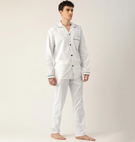 Bottom Closure :Drawstring Bottom Fabric : Pure Cotton Bottom Pattern : Printed Bottom Type : Pyjamas Neck : Lapel Collar Print or Pattern Type : Polka Dots Sleeve Length : Long Sleeves Sustainable : Regular Top Fabric : Pure Cotton Top Pattern : Printed Top Type : Shirt Wash Care : Machine Wash