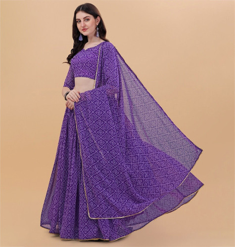 Purple & White Printed Semi-Stitched Lehenga & Unstitched Blouse With Dupatta