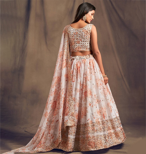 White & Peach-Coloured Embroidered Sequinned Shibori Semi-Stitched Lehenga & Unstitched Blouse With
