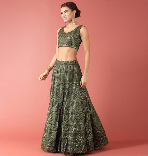 Olive Green & Gold-Toned Embellished Sequinned Semi-Stitched Lehenga Set