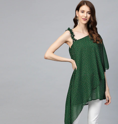 Women Green & Golden Printed One Sleeve Asymmetric Layered Tunic