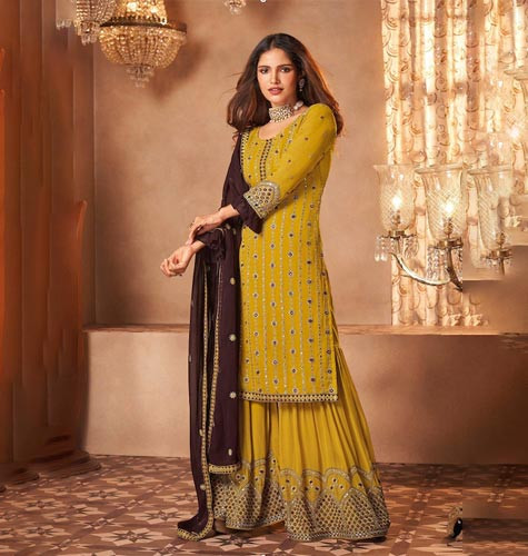 Yellow & Brown Embroidered Semi-Stitched Dress Material