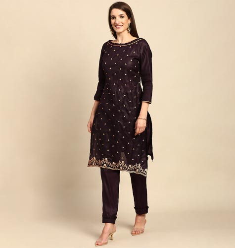 Wine-Coloured & Golden Zari Embroidered Unstitched Dress Material