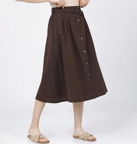 Women Brown Solid Cotton Casual-Fit A-Line Midi Skirt