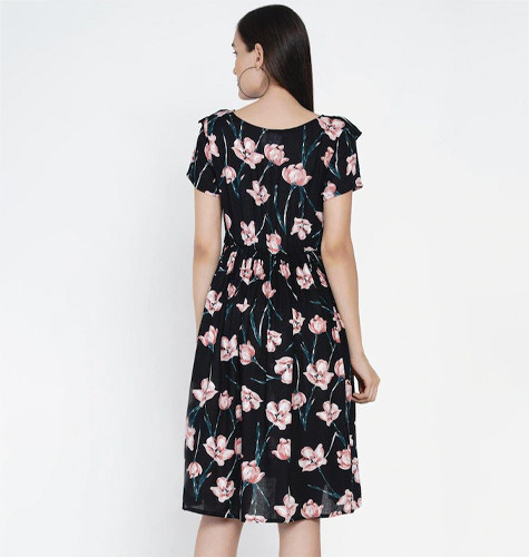 Women Black & Pink Floral Printed Viscose Rayon Maternity A-Line Dress