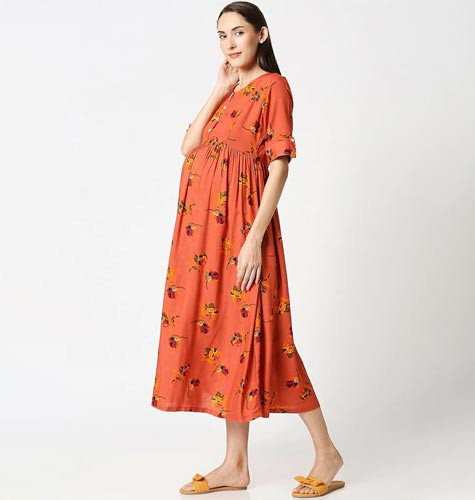 Orange Floral Printed Maternity Empire Midi Dress