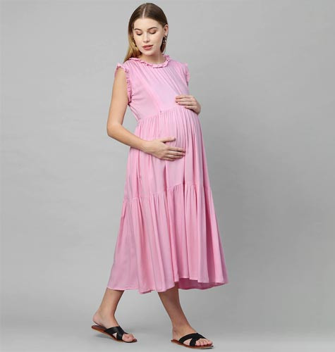 Pink A-Line Maternity Midi Nursing Dress