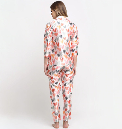 Women Cream & Red Printed Silk Satin Night Suit