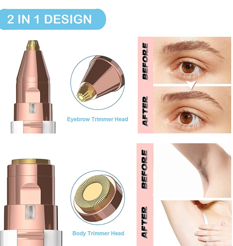 1. 2 in 1 Design: One Trimmer for All. Quickly switch between the desired modes. Detail head of this precision hair remover is best for trimming eyebrows, nose hair, neck, bikini line and beard details, which precisely removes the hairs. Round head of facial hair remover perfectly fits the skin and remove the hair from arms, legs, and back high-efficiently.2. Safe and 100% Painless: Built with high-quality, anti-allergic stainless steel blade, this flawless hair remover follows and stays in contact with the individual contours of your body, safety for sensitive skin. Compared with traditional wax paper hair removal and tweezers, there is no skin irritation, scratches, and painful pulls by using our painless hair remover.3. USB Rechargeable&LED Light: 2 in 1 electric eyebrow razor coming with a USB cable, you can charge it with power bank, PC, socket. Fully charged in 6 hours, you can enjoy 70 minutes cordless shaving! Electric eyebrow shaver with built in bright LED light provides blind spot of vision, ensuring that any peachy fluff is not missed.