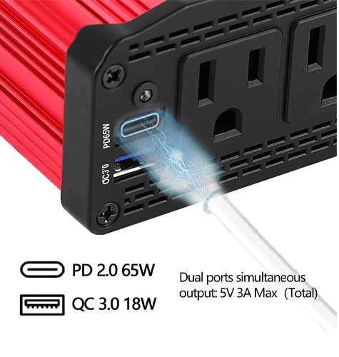 【Premium 300W Power Inverters】Especially Updated With USB-C PD65W, USB QC18W, Provides 300 watts continuous DC to AC power and 600 watts of peak power. Great for charging string lights, laptop, breast pump, CPAP machine, nebulizer, game console, kindle, TV, DVD players, lights, iPad, and other electronic devices. 【Fast Charging】This car power inverter features dual 110V AC outlets and 2 USB ports.USB-C PD65W, USB QC18W ports can automatically detect your devices to deliver optimal charging speed, great for your kindles, iPhones, iPads, tablets, MP3 players, cameras, and other mobile devices