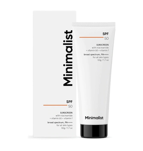 Minimalist SPF 50 PA++++ Multi Vitamin SunscreenA light weight, moisturiser-meets-sunscreen. This broad spectrum SPF 50 with PA++++ rating, has a very light texture that spreads easily & disappears leaving behind a natural, moisturised, non-shiny look.Loaded with Vitamins A, B, E & F that help repair skin and minimise damage caused by UV exposure.Why is it awesome?This sunscreen is formulated with 4 very effective UV-filters, namely, Uvinul T 150, Avobenzone, Octocrylene and Titanium Dioxide to provide protection from UVA & UVBBoosted with Vitamin A, B3, B5, E and F that not only repairs skin after sun exposure, but also soothes, nourishes and hydrates skinThoroughly tested by an independent lab and confirmed SPF of 50 was obtainedIt is a photostable sunscreen offering you more efficient & prolonged protection from UV.Also, it does not leave any white cast on application. It spreads easily like a lightweight moisturiser and does not leave behind unwated residue or heavy feelingThe primary filters are sourced from BASF, Germany and Royal DSM, Netherlands