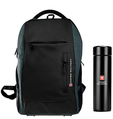Grey and black brand logo backpacks Padded ergonomic shoulder straps, has padded haul loop 3 main compartment with zip closure, has padded laptop compartment, has a tablet sleeve 2 pocket with organiser, 2 zip pockets Padded mesh back Features: usb charging port hip strap Water Resistance: water resistant Comes with a rain cover Warranty: 1 year Warranty provided by brand owner/manufacturer Size & Fit Height: 47cm Width: 19cm Depth: 32 cm Volume: Up to 23 Litres Laptop compartment can hold Up to 15 inch laptop Flask capacity: 480 ml Material & Care Material:-Product 1:- Polyester, Product 2:- Stainless Steel, 480 ML, Care:- Wipe with a clean, dry cloth when needed
