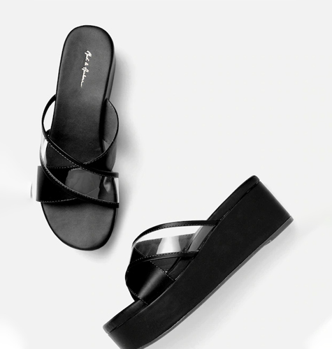 A pair of black and transparent open toe heels, has regular ankle and open backSynthetic solid upperCushioned footbedTextured and patterend outsole, has a wedge heelWarranty: 1 monthWarranty provided by Brand Owner / ManufacturerSize & FitHeel height: 7.62 cm (3 inches)Material & CareUpper material: SyntheticWipe with a clean, dry cloth to remove the dust